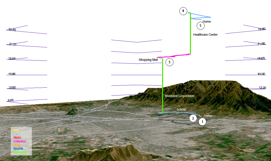 La dimensión espacio-temporal de las prácticas fue incorporada a través de mapas espacio-temporales, para los cuales se registró el tiempo y la locación, los cuales eran después georreferenciados en los mapas. Los mapas fueron usados de un modo cualitativo, para proveer una expresión clara del uso espacial de la ciudad. Fueron complementados con narrativas para describir las experiencias que las personas tenían durante sus viajes diarios, particularmente en términos de las estrategias utilizadas para la movilidad y las consecuencias que éstas tenían sobre sus vidas cotidianas.