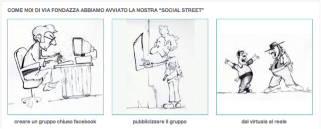 El caso es el de Social Street, una experiencia socio-urbana que nace en el norte de Italia en 2013, fruto de la iniciativa de un residente de Via Fondazza en Bolonia, Federico Bastiani, quien simplemente quería saber quien vivía cerca de su casa, compartir intereses comunes y tal vez aumentar la interacción social en su barrio. Bastiani armó entonces un grupo cerrado en Facebook con el nombre de “amigos de Via Fondazza”, diseñó carteles promocionando el grupo, explicando los objetivos e incluyendo la contraseña, permitiendo a todo el que quisiera convertirse en un administrador del grupo. Luego, pegó los carteles alrededor del barrio y rápidamente los habitantes empezaron a prenderse con la idea, discutiendo problemas locales, compartiendo intereses y necesidades. Por ejemplo, uno de los post iniciales fue: “Escucho todos los días a alguien tocar el piano, ¿quién es? Me gustaría tomar clases”. La respuesta: “¡Soy yo! Te puedo dar clases cuando quieras”. Fue así como relaciones creadas en un grupo virtual se convirtieron en relaciones en la vida de barrio, tanto así que el slogan de Social Street es “desde lo virtual a lo real”.